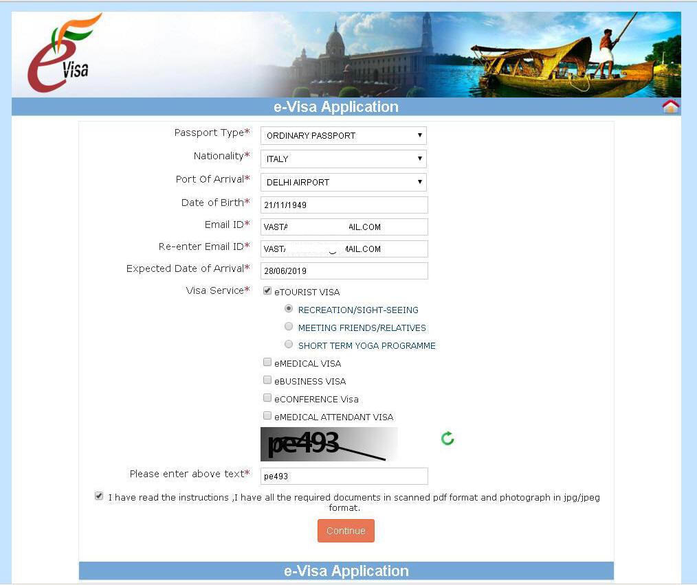Se hai cliccato Apply here for E-visa, si apre la prima schermata (vedi sotto) Scegli: Passaporto ordinario (Ordinary passport) Aeroporto di entrata: Delhi Airport NB: l'aeroporto di ingresso è indicativo, puoi entrare anche da altri aeroporti se ti viene cambiato il piano voli. Chiedi Tourist Visa e sottocategoria Recreation /sightseeing Compila i campi e quindi scrivi il captcha e prosegui con Continue.