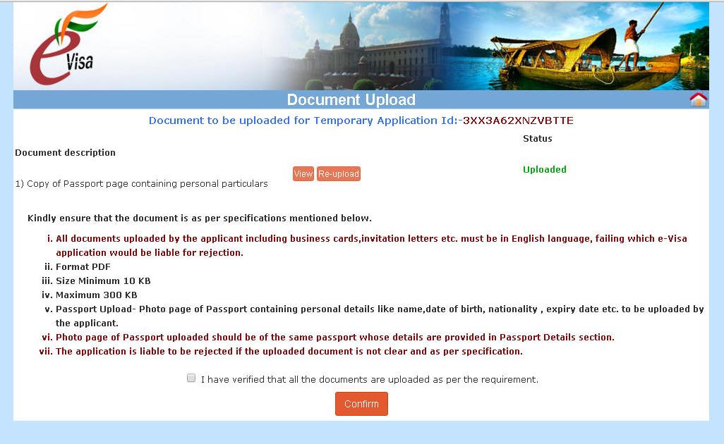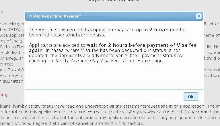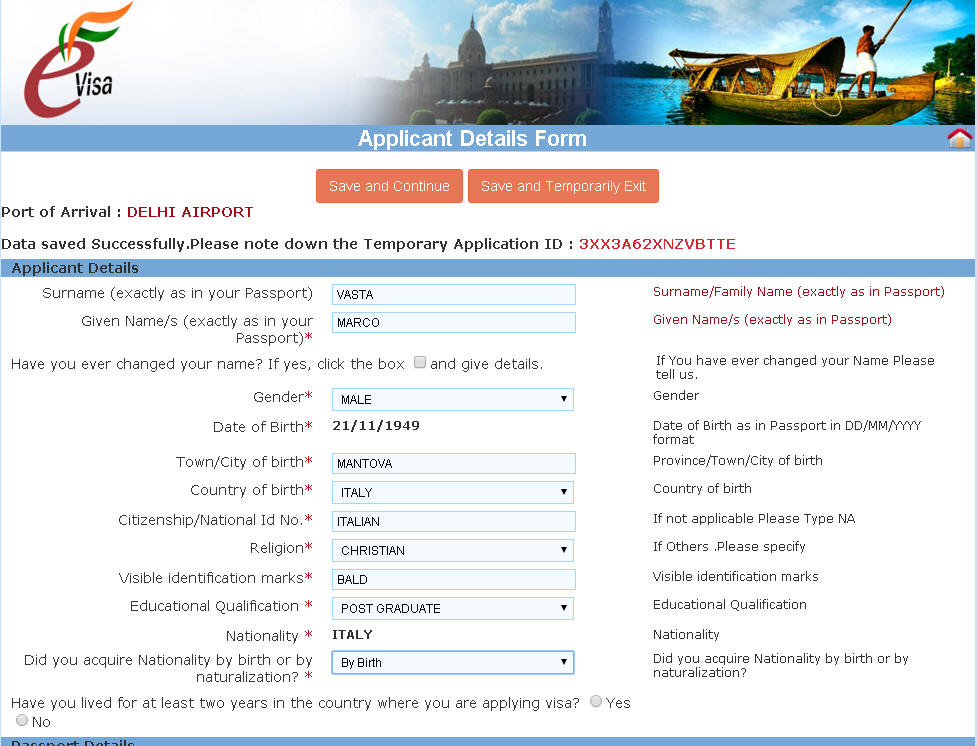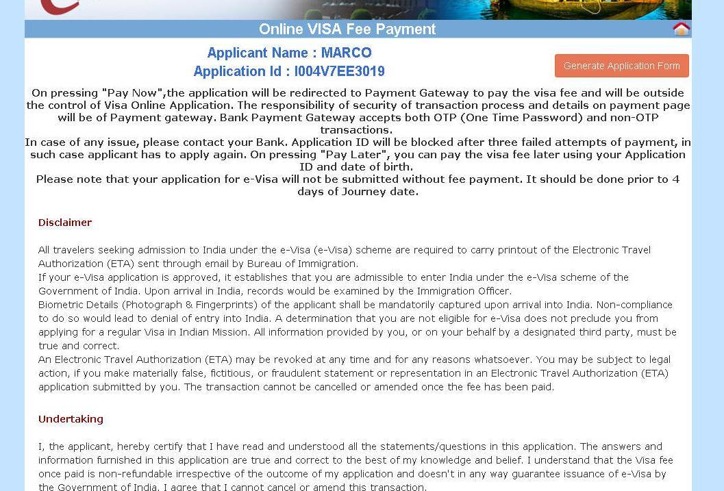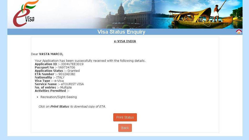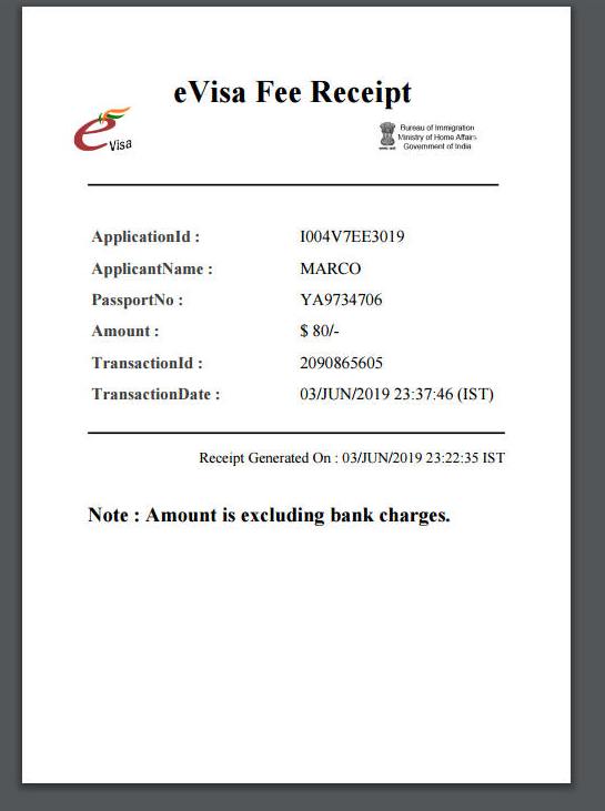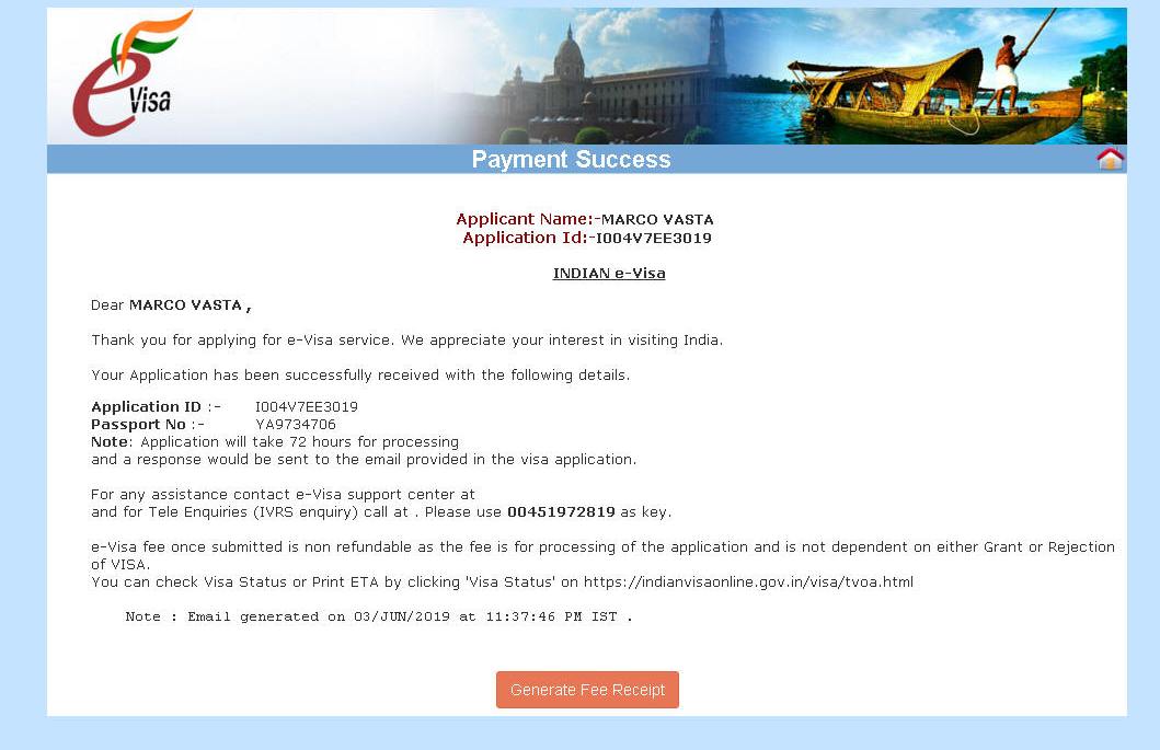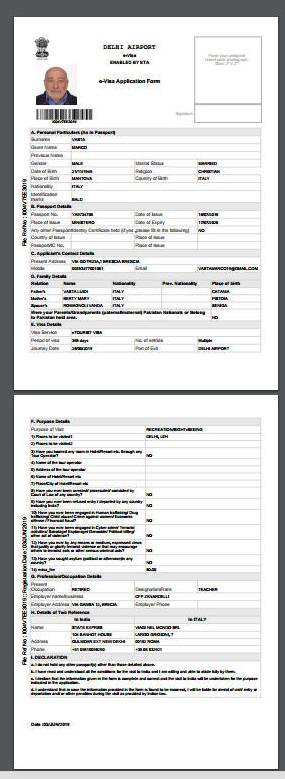Automaticamente si genera e si scarica il modulo stampato. ATTENZIONE NON È IL VISTO. Successivamente controlla la procedura per scaricare un secondo PDF con la richiesta di visto e la fotografia a DESTRA (vedi sotto) da presentare in aeroporto. Il visto vero e proprio viene apposto in aeroporto a Dehi al bancone E-VISA. Genera la ricevuta che si scaricherà automaticamente in PDF