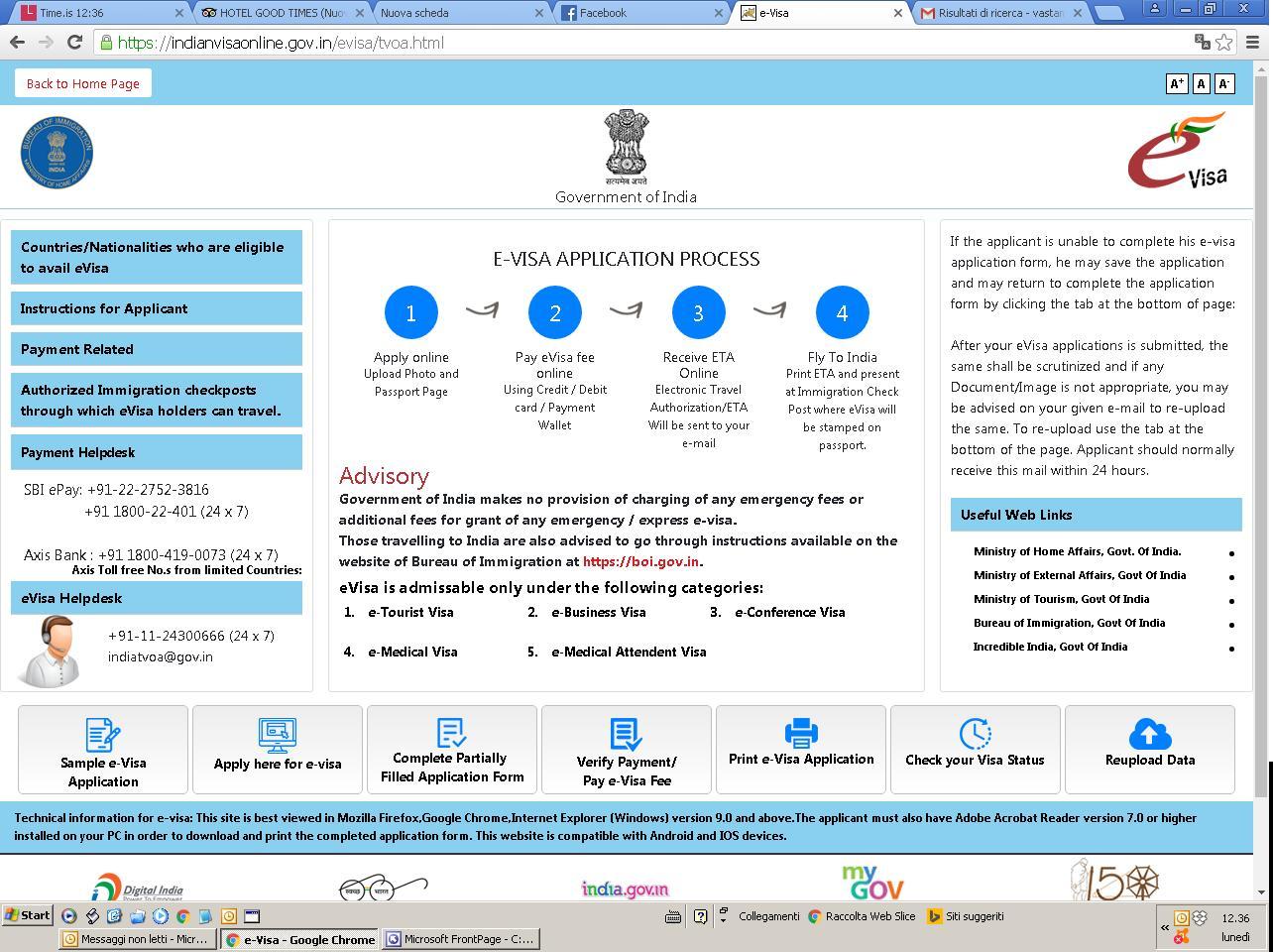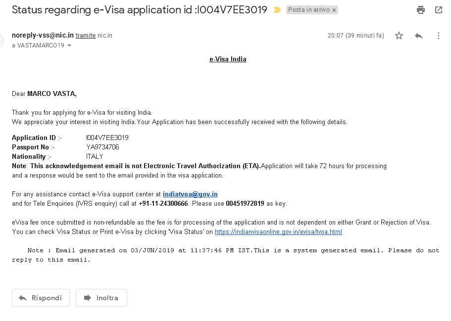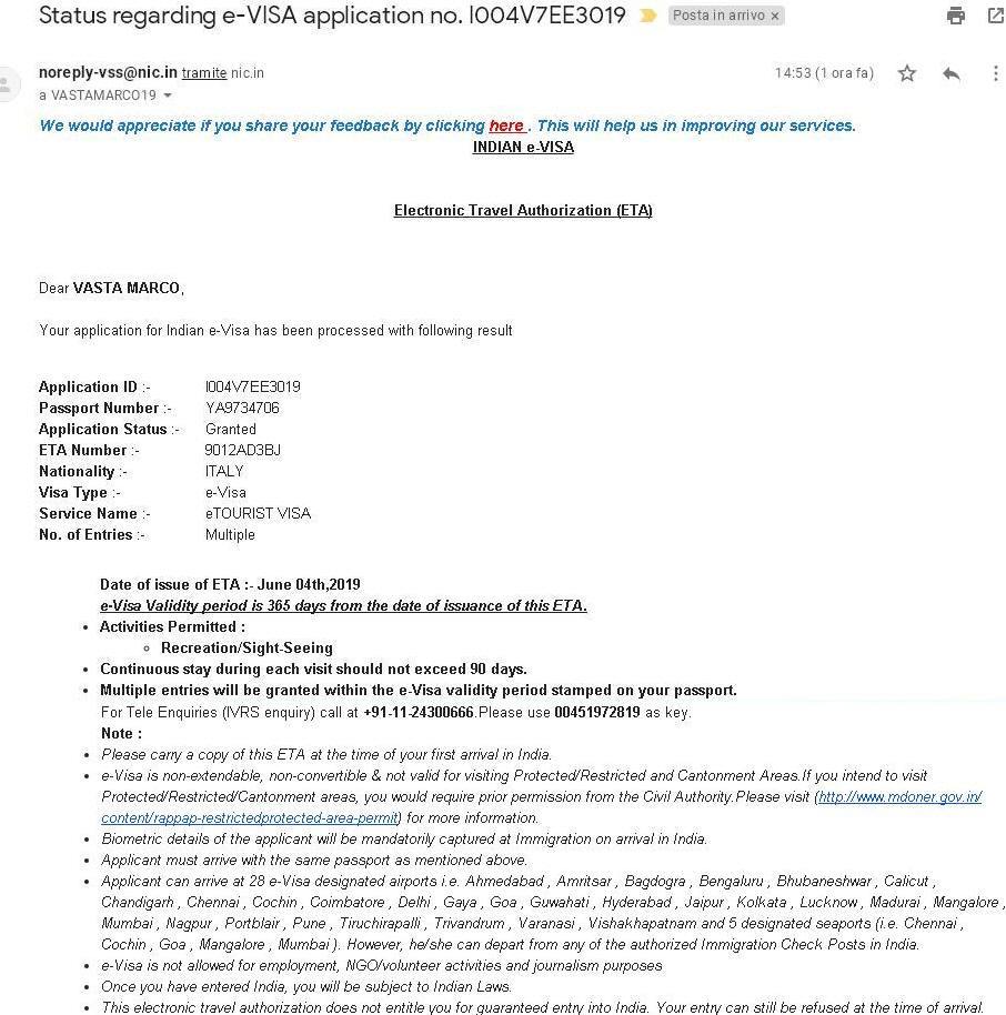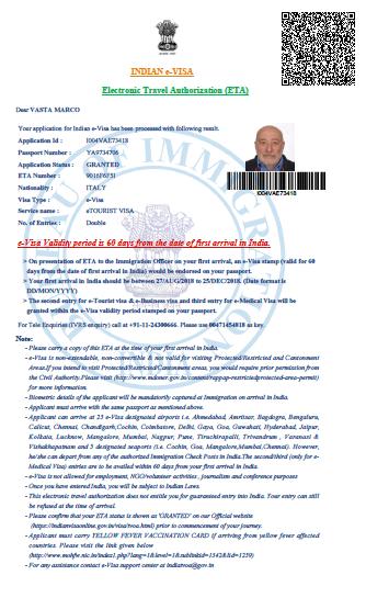 ATTENZIONE Nonostante le chiare istruzioni sul sito AnM DEVI CONCLUDERE correttamente la procedura del e-visa. Stampa anche il VISTO vero e proprio che si chiama INDIAN e-VISA Electronic Travel Authorization ETA, di una sola pagina (vedi più avanti). Non solo il modulo (sopra)che si chiama e-Visa ENABLED BY ETA e-Visa Application Form (che ha lo spazio per incollare una foto per intenderci e ha due pagine) e la foto a sinistra. Riepilogo: