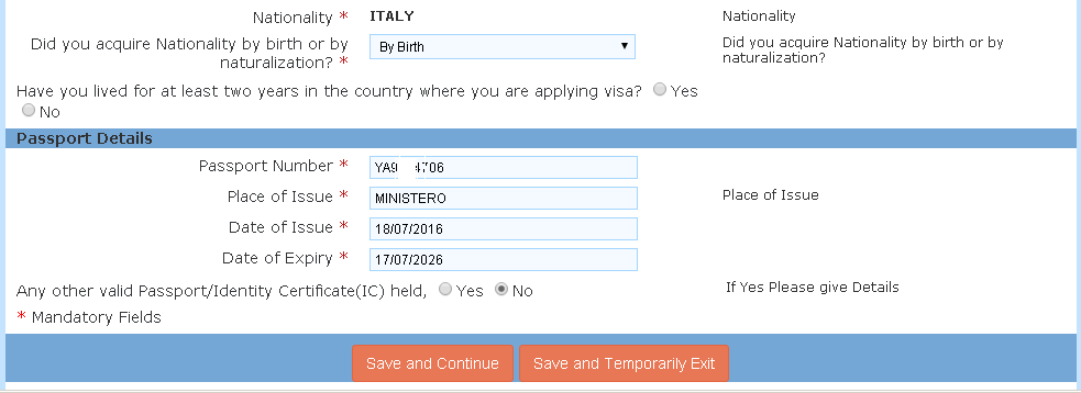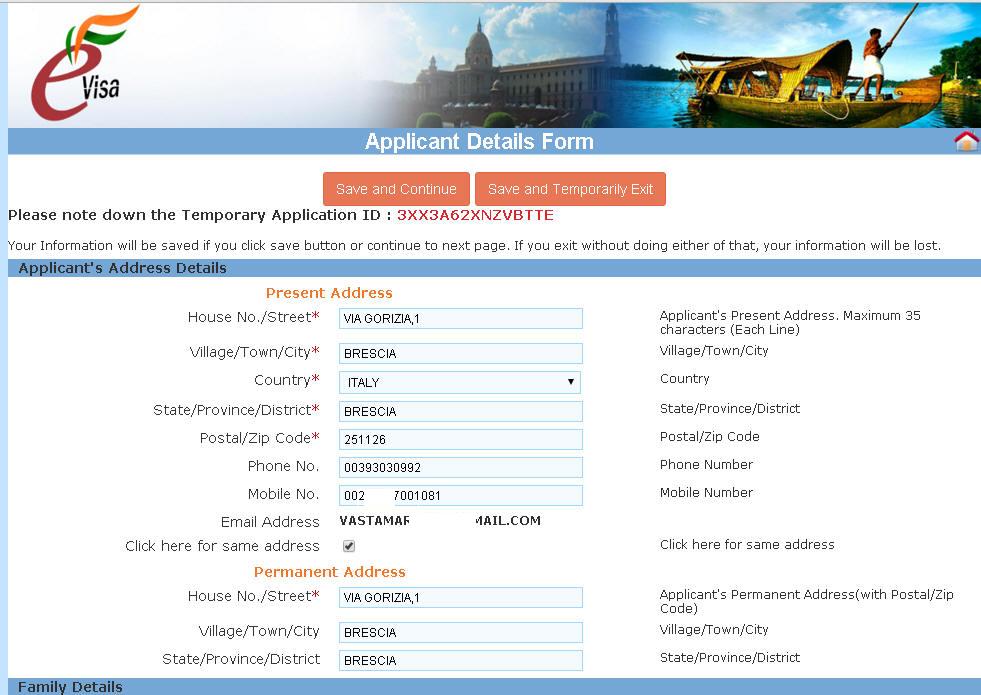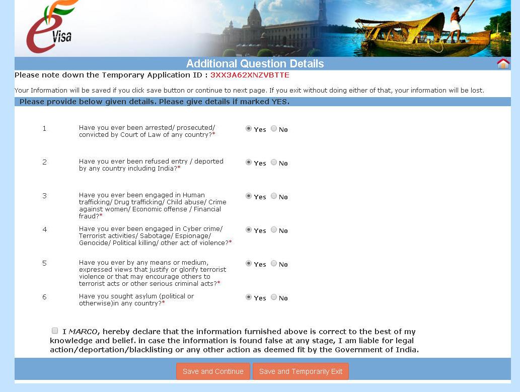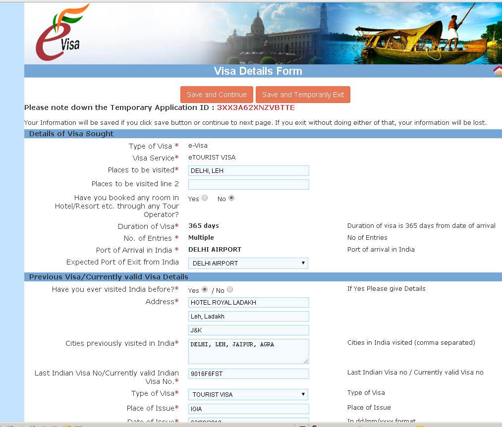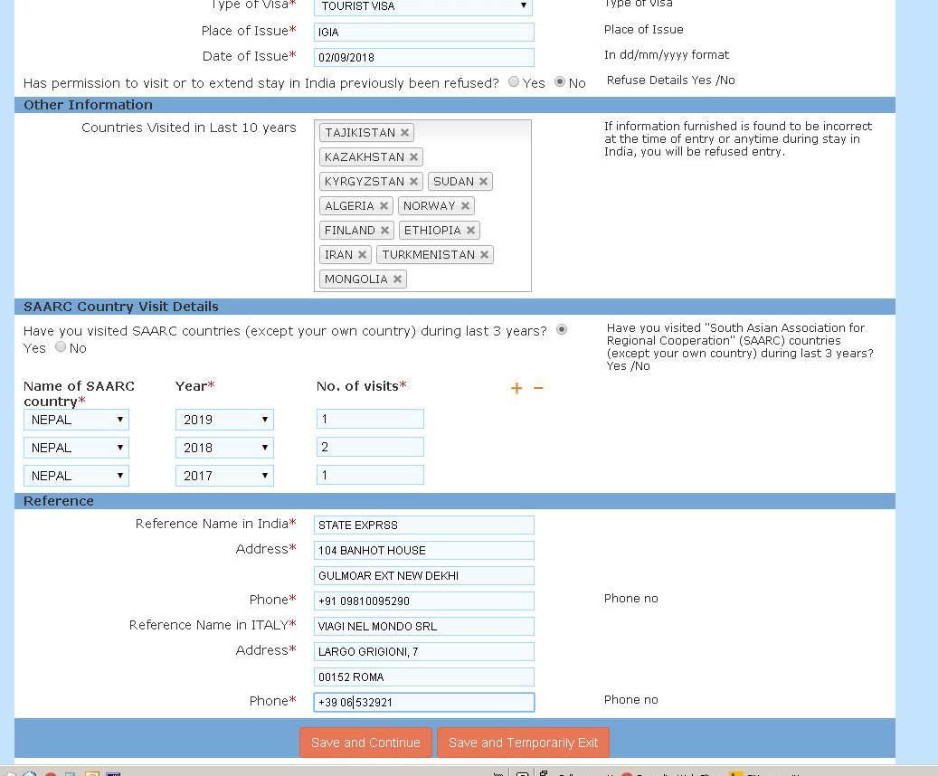 Con la seguente schermata (sotto) si riempiono altri campi per la richiesta visto. Riguardano alloggio in India, visti precedenti, paesi visitati, i paesi dell'area SARC (subcontinente indiano) Alla fine Salva e continua (Save and Continue) oppure Salva ed esci temporaneamente (Save and Temporarly Exit) Se continui, si apre un'altra schermata (sotto)