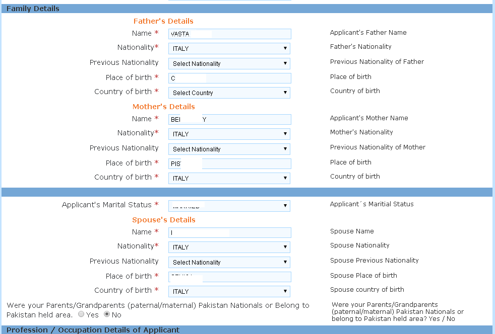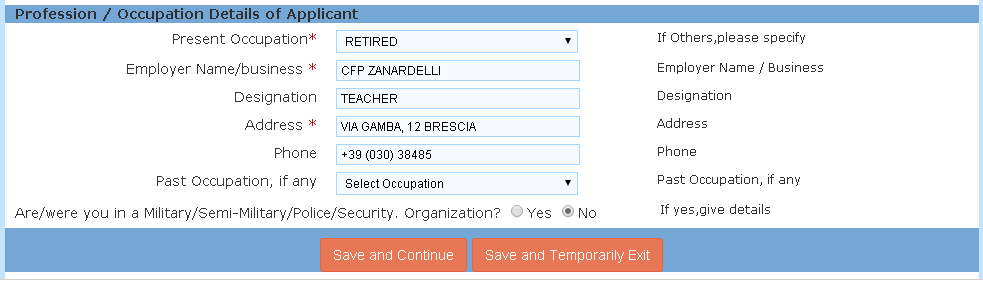 Se hai scelto Save and Continue, si è aperta la terza schermata. Qui vengono inseriti i dati dei tuoi ascendenti e di eventuali coniugi (ne viene considerato uno solo per i cittadini italiani). Anche se sei pensionato (RETIRED) ti chiederà il nome del datore di lavoro... Salva e continua (Save and Continue) oppure Salva ed esci temporaneamente (Save and Temporarly Exit) Se continui, si aprirà un'altra schermata.